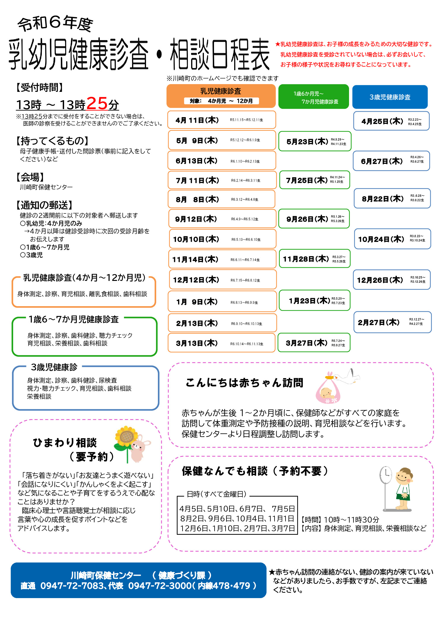 川崎町では、乳児(4か月児~12か月児)、1歳6か月児、3歳児を対象にお子さんの健診を実施しています。