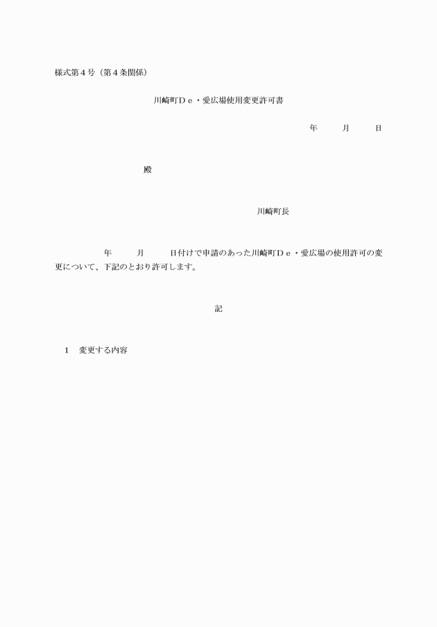 第1条 この規則は、川崎町De・愛広場の設置及び管理に関する条例(令和4年条例第12号。以下「条例」という。)の施行に関し必要な事項を定めるものとする。