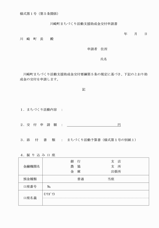 第5条 助成金の交付を受けようとする者(以下「申請者」という。)は、川崎町まちづくり活動支援助成金交付申請書(様式第1号)を町長に提出しなければならない。