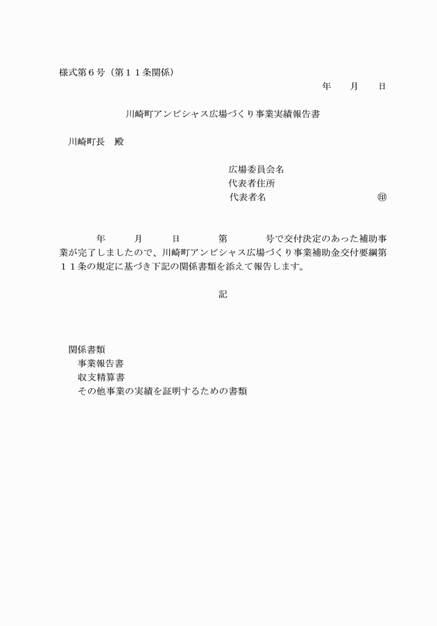 第11条 広場委員会は、広場づくり事業が完了したときは、完了した日から起算して15日を経過した日又は補助金の交付のあった日の属する年度の翌年度の4月5日のいずれか早い日までに、速やかに川崎町アンビシャス広場づくり事業実績報告書(様式第6号)に関係書類を添えて、町長に報告しなければならない。